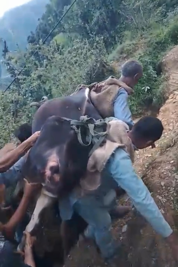 बीमार गाय को पीठपर उठाकर अस्पताल पहु...